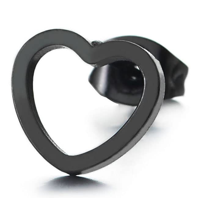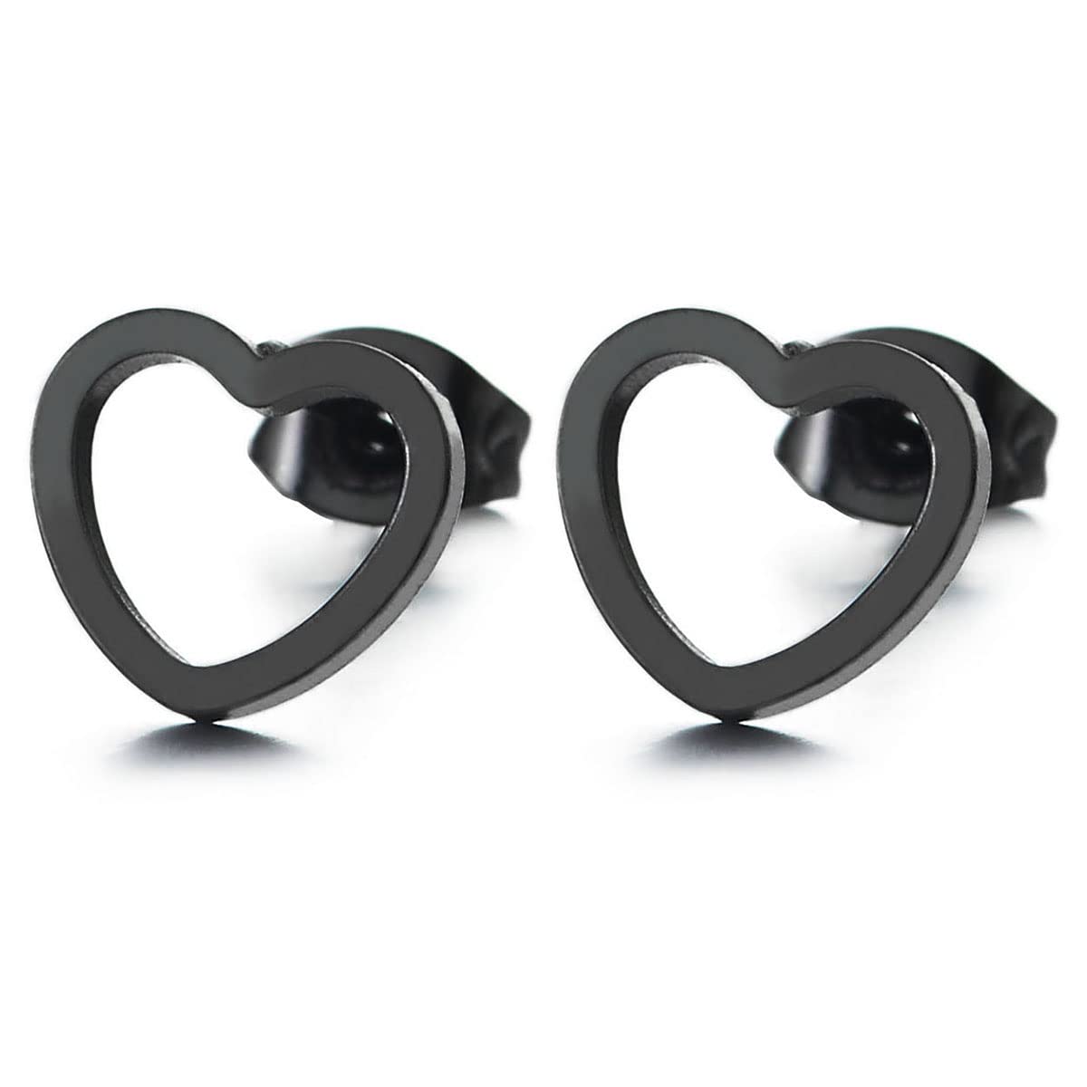 Pair Stainless Steel Womens Small Black Flat Open Heart Stud Earrings - COOLSTEELANDBEYOND Jewelry
